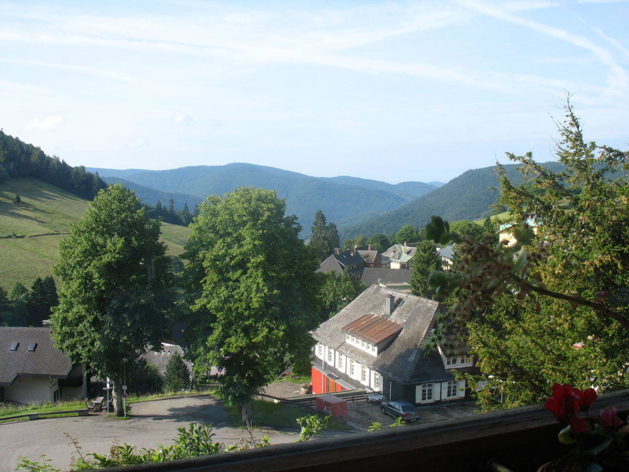 Blick vom FrühstücksraumBlick auf den Ort Todtnauberg (auf die Buswendestelle) und die umliegenden Berge
