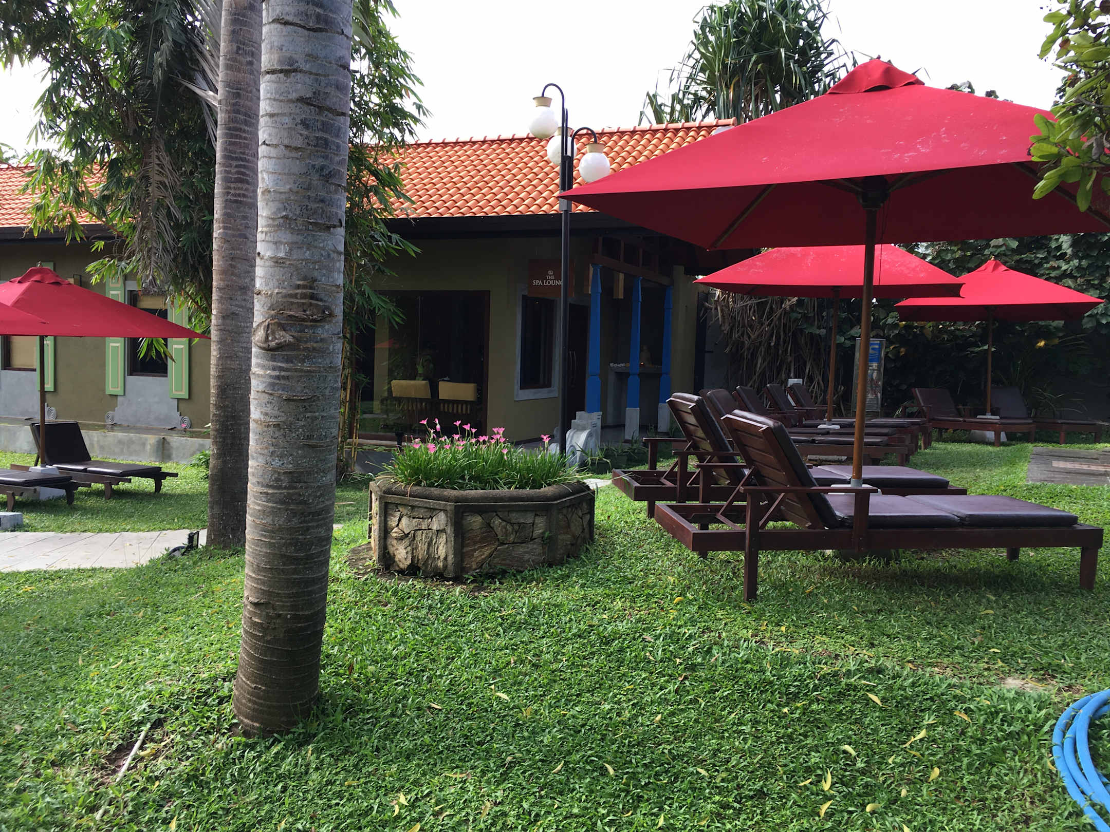 Liegestühle am Pool, im Hintergrund Spa-Bereich