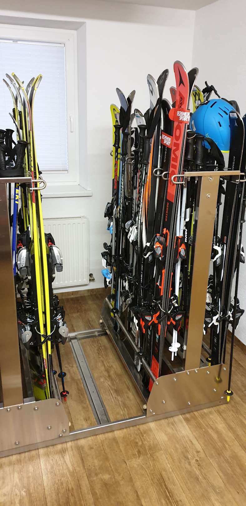 Skiraum. Zwei verschiebbare Skiständer mit ausreichend Abstellplätzen für die Ski der Hotelgäste. Der Raum ist nur mit Zimmerkarte zu betreten und direkt neben dem ebenerdigen Hoteleingang gelegen.