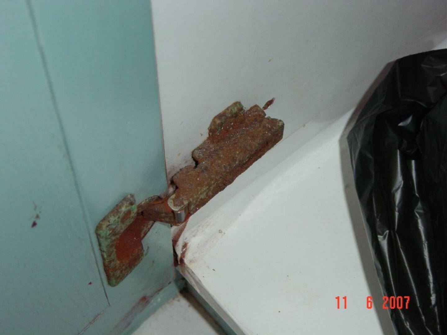 Scharnier der Tür wird nur noch durch Korrosion zusammengehalten!