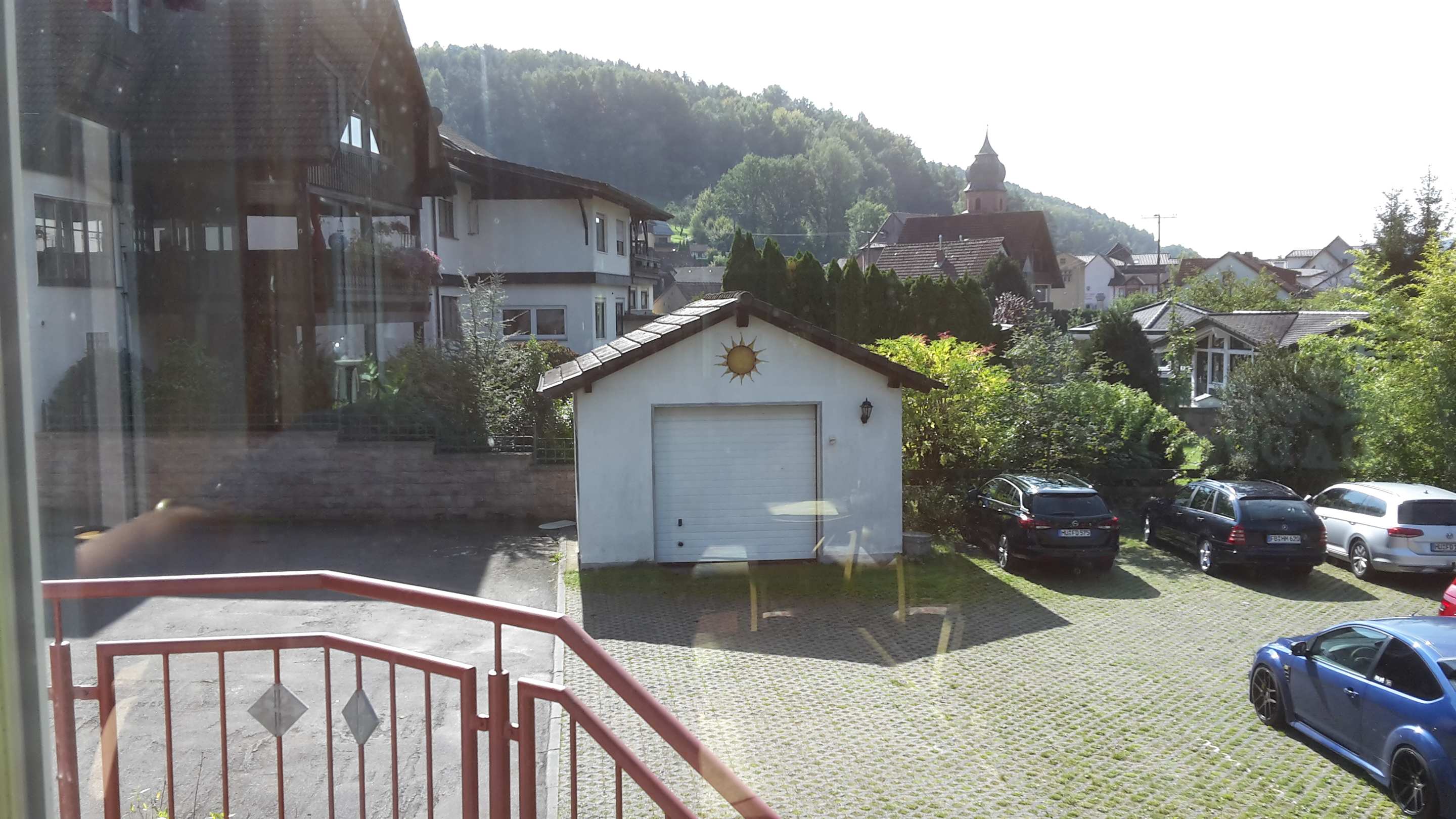 Der Blick aus dem Wintergarten auf den Parkplatz
