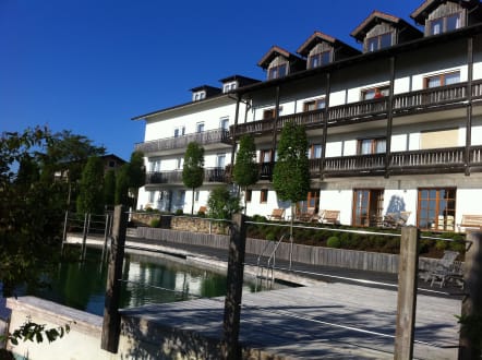 Blick aus dem Garten auf das Hotel
