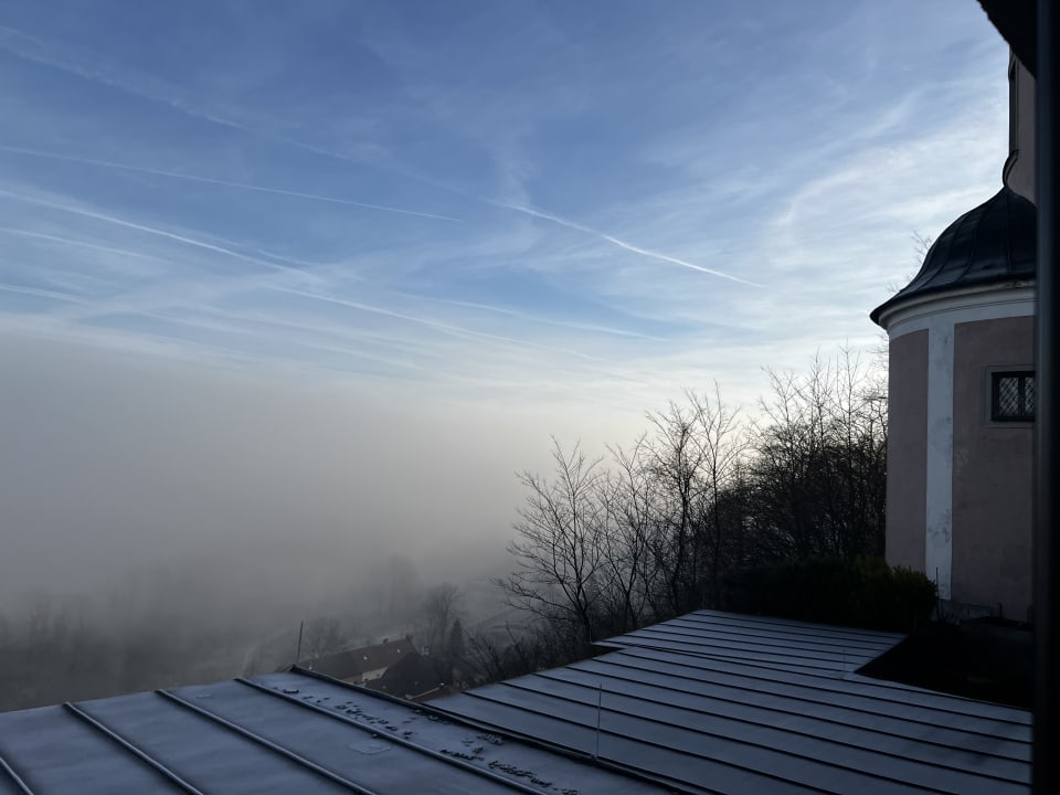 Mystisch, der Blick aus dem Zimmer im Morgennebel.