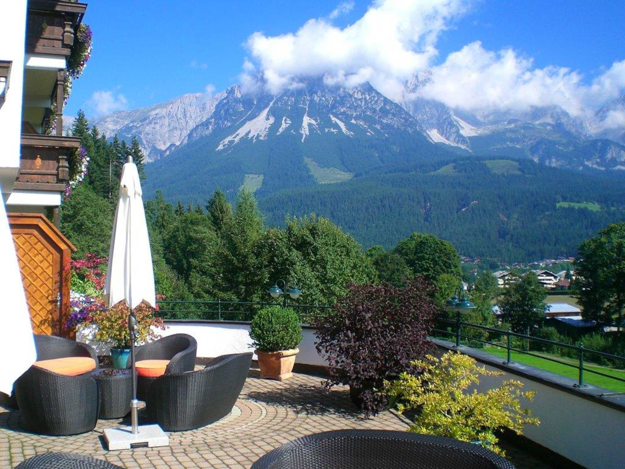 Vor dem HoteleingangHier ist ein Teil der Sitzgruppen vor dem Hoteleingang mit Blick auf den Wilden Kaiser zu sehen.