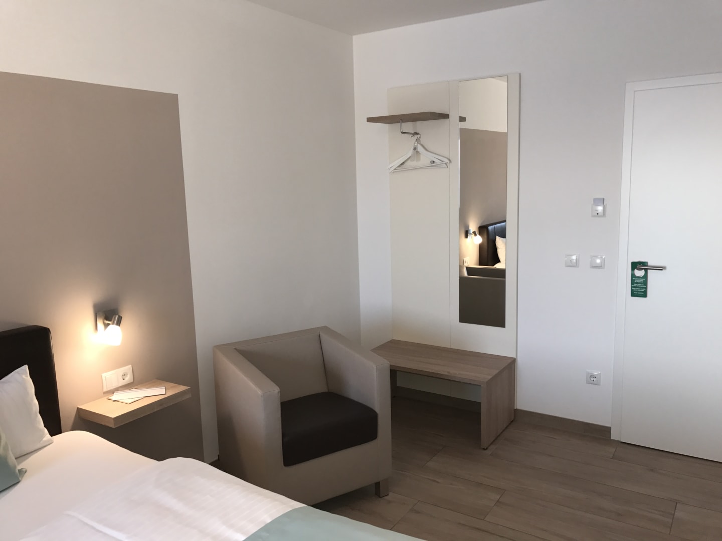 ZimmerSchönes großes Zimmer mit Sessel, Spiegel, Schreibtisch, Schreibtischstuhl, Garderobe, Kleiderschrank, Flat-TV
