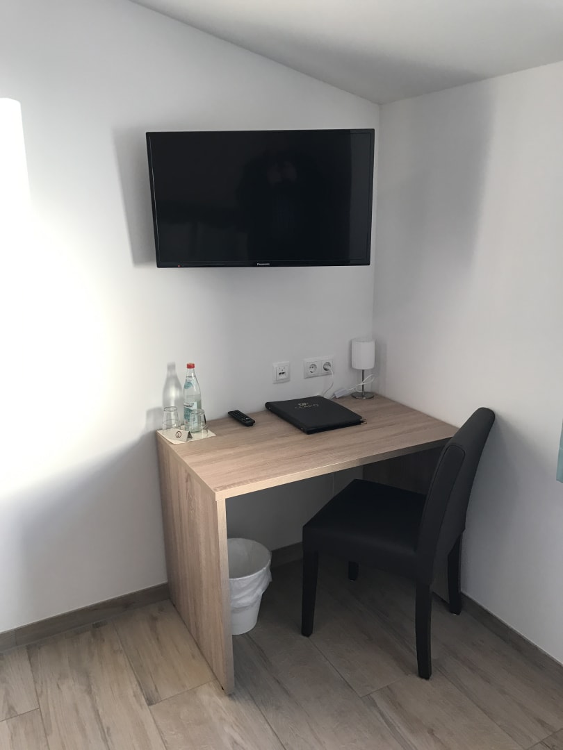 ZimmerSchönes großes Zimmer mit Sessel, Spiegel, Schreibtisch, Schreibtischstuhl, Garderobe, Kleiderschrank, Flat-TV