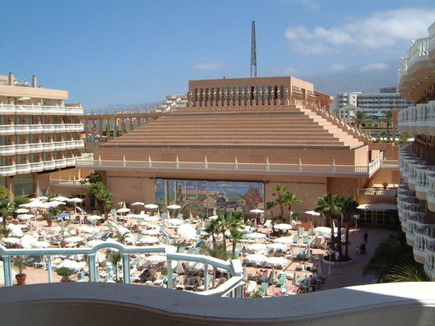 Balkonblick PoolseiteBlick aus der vierten Etage über den Innenbereich auf die Pyramide De Arona