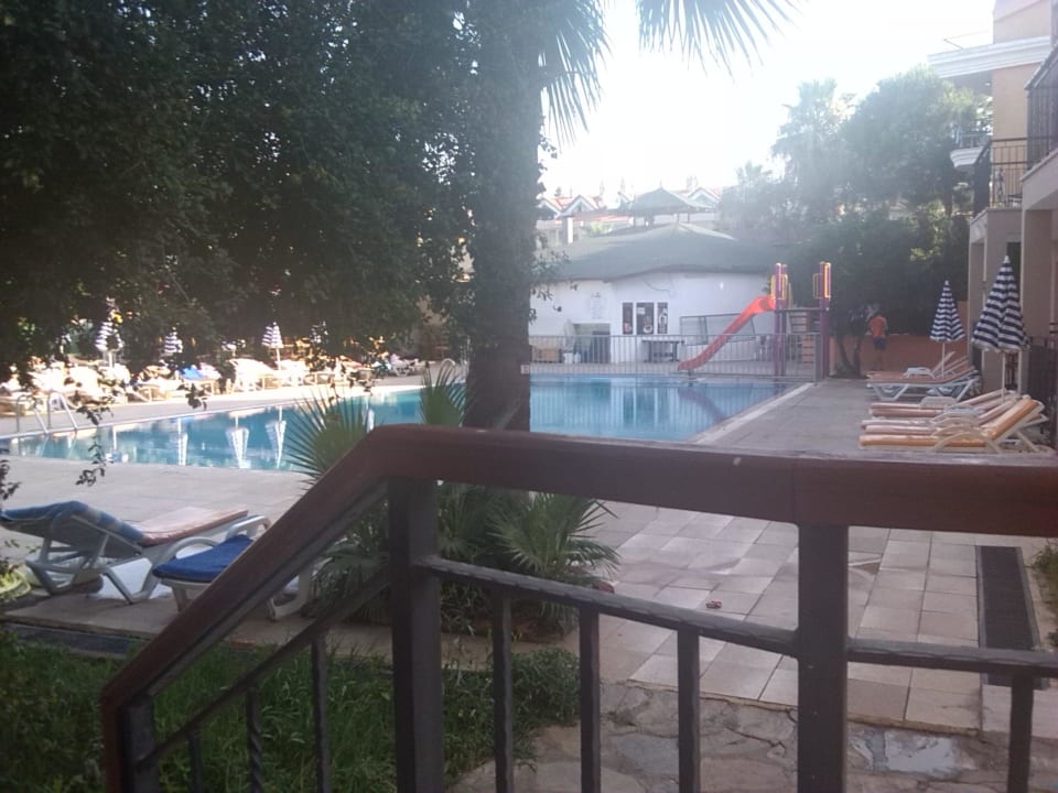 Uitzicht vanaf de kamer op het zwembad achter