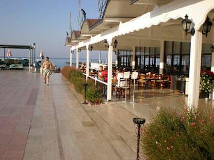 rechts das Hauptrestaurant mit Speisesaal, gerade aus der Hotelstrand(30m) mit Blick aufs Meer, 10m links aber nicht auf dem Bild der Pool
