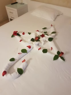 Überraschung auf dem Bett.Sehr liebevoll dekoriert