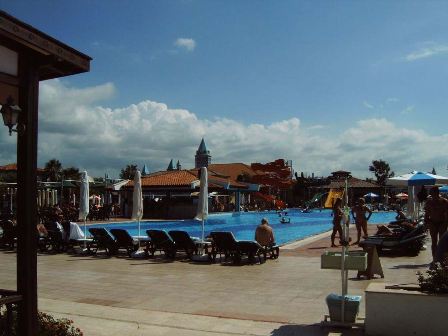 Poolaufnahme im Hintergrund die 3 Rutschen.