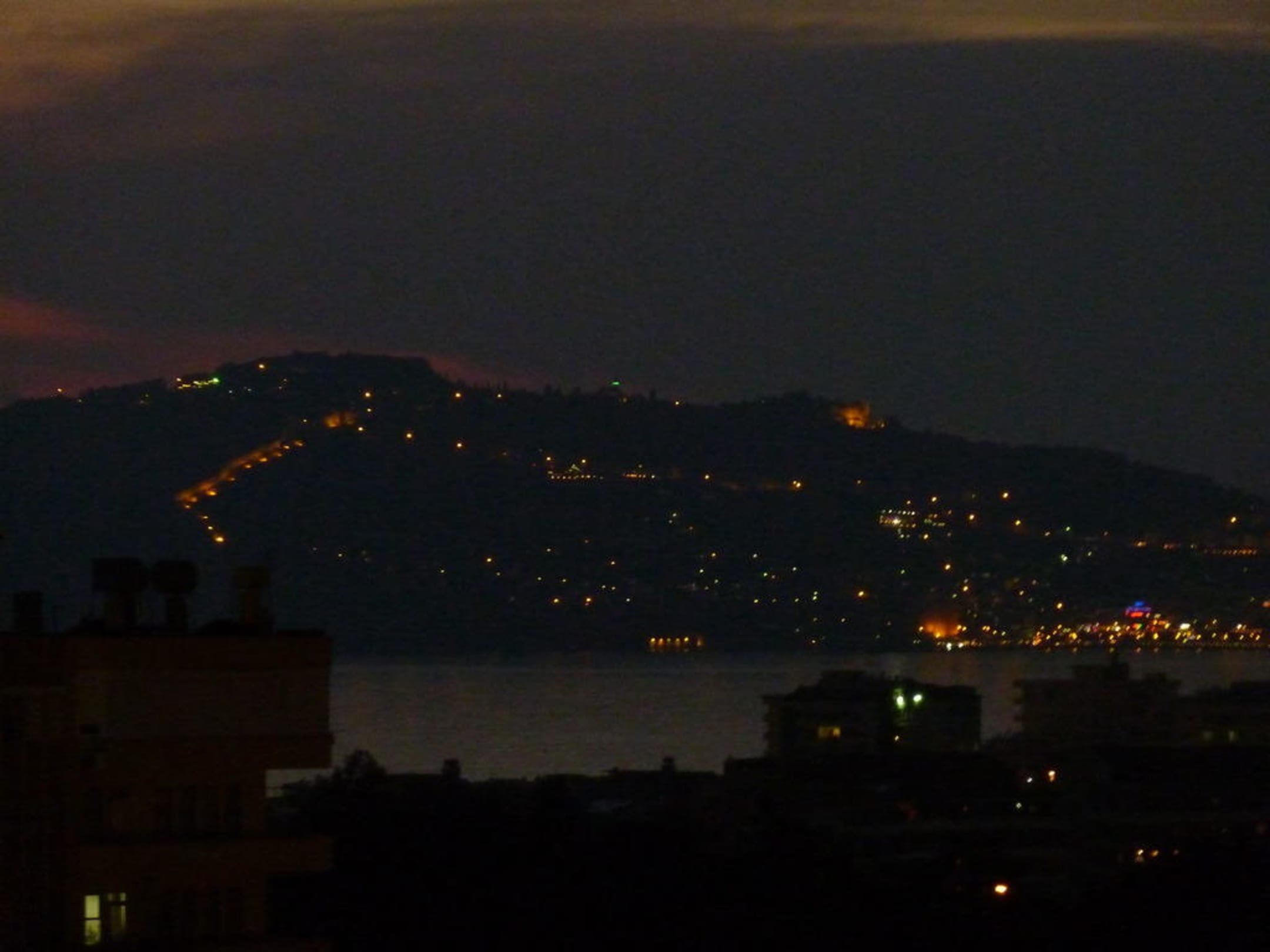 Nächliches AlanyaBlick von der Speiseterasse auf die beleuchtete Festung, Alanya und den Hafen
