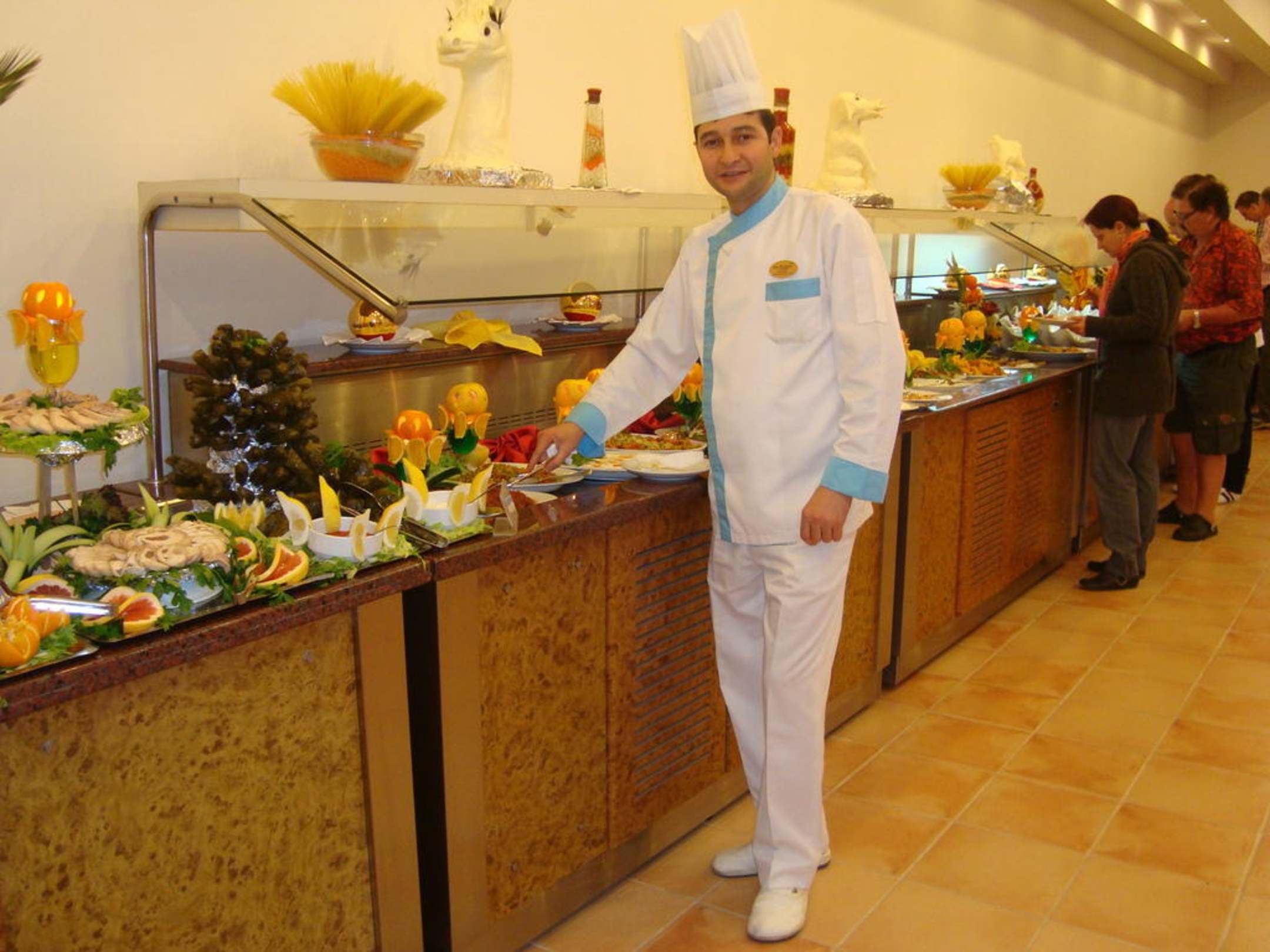 Er stellt die schönen Figuren - die weißen aus Margarine und die orangen aus Melone - her ... Vielen Dank noch mal für das wunderbare ESSEN