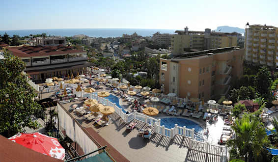 Ausblick von Zimmer 1622Blick von Zimmer 1622 (Haus Italy) über den Hauptpool Richtung Meer - links das Hauptgebäude, neben dem Pool Haus F