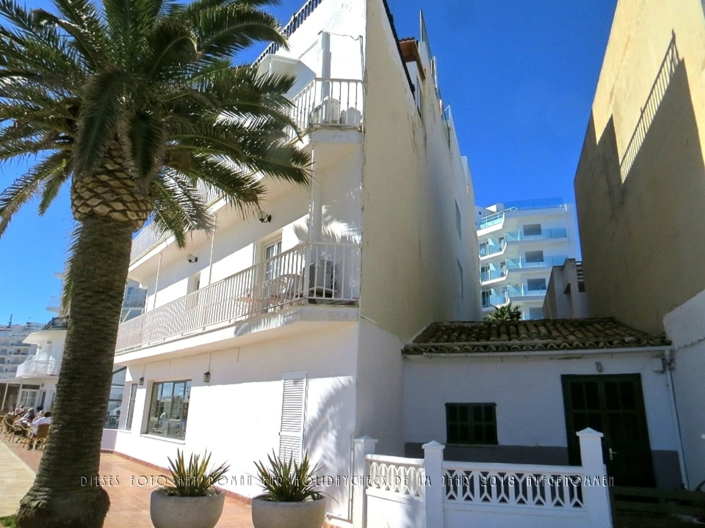 AußenansichtLinks ein Gebäudeflügel des Hotel S'illot. fotografiert von der öffentlichen, befestigten Strandpromenade aus.