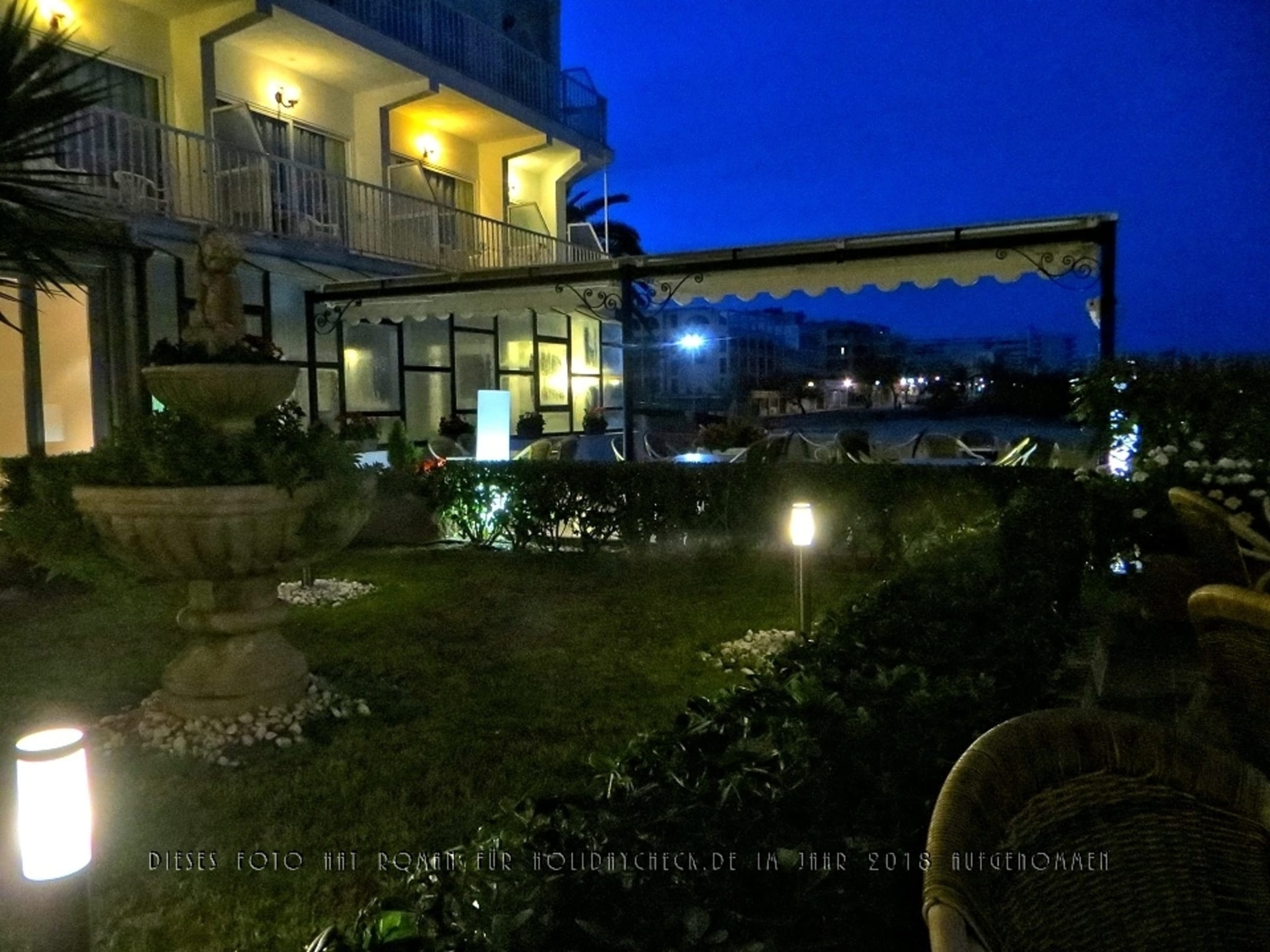 Nächtlicher Blick von der Außenterrasse zum Meer und auf die Gartenanlage.