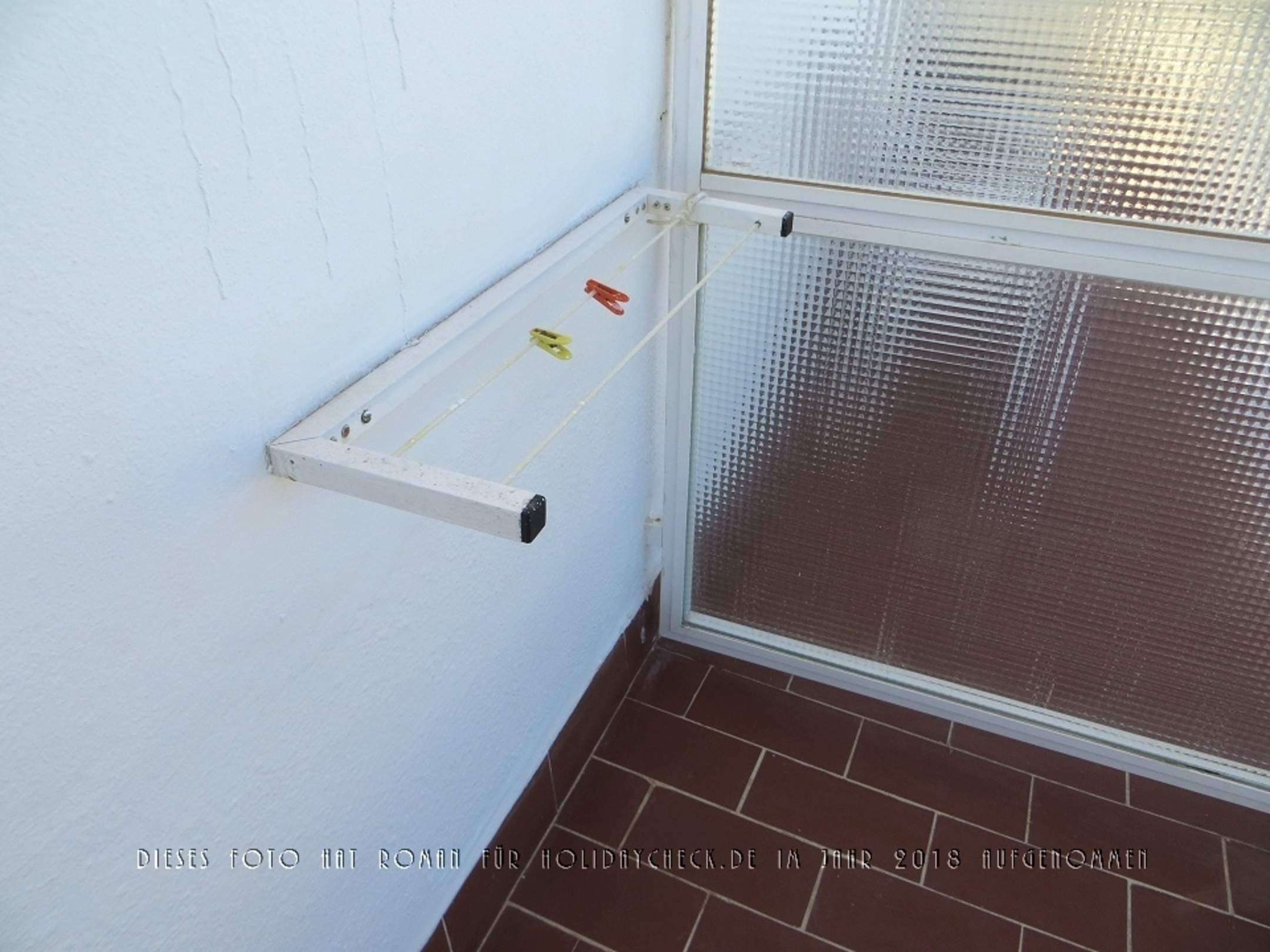 Ein kleiner Wäschetrockner mit zwei kurzen Leinen auf dem Hotelzimmerbalkon.