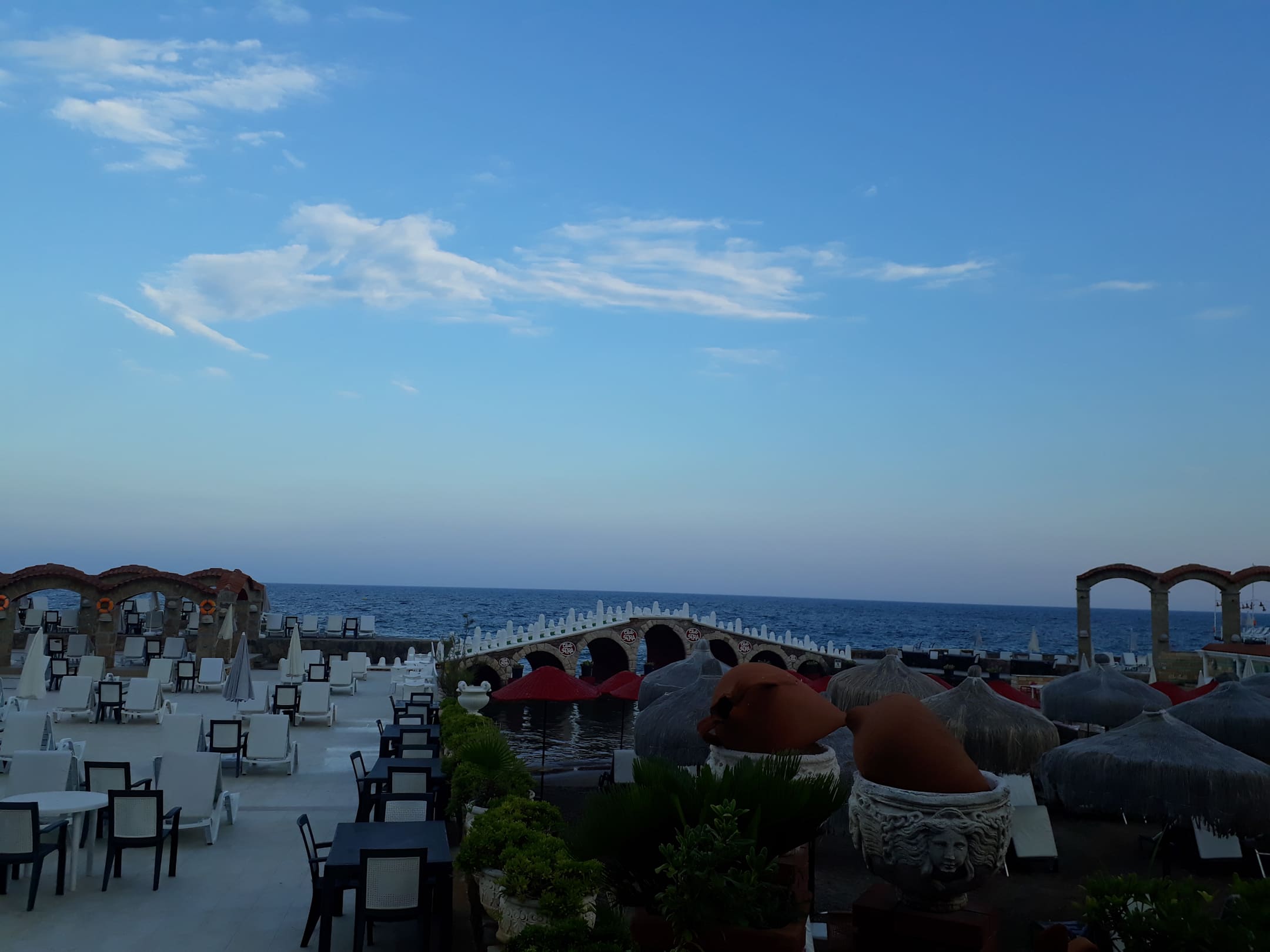 Ausblick vom Mexico-Restaurant auf den Kinderstrandbereich und Brücke. Linker Hand der Stone-Beach.