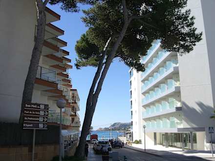 Blick von der Straßenecke aus auf Hotel Clumba (links) und das neueröffnete Hotel Son Moll Sentits (rechts) Richtung Promenade/Meer
