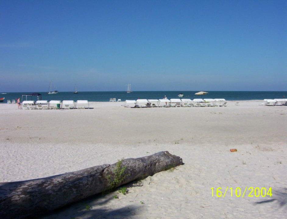 Blick vom Pool aus zum MeerEin wunderbar schöner, feiner weißer Sandstrand. Der Strand vom Hotel Coche Paradise bietet genug Platz.