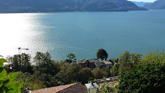 Blick vom Wanderweg Sentiero Romano auf das Hotel und den Lago Maggiore