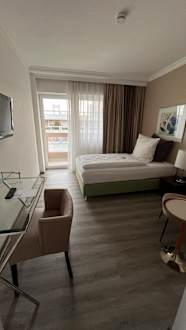 ZimmerRenoviertes Zimmer, mit kleinem Arbeitstisch und zwei Sitzgelegenheiten. Besonders gefällt mir, dass KEIN Teppich verlegt ist.