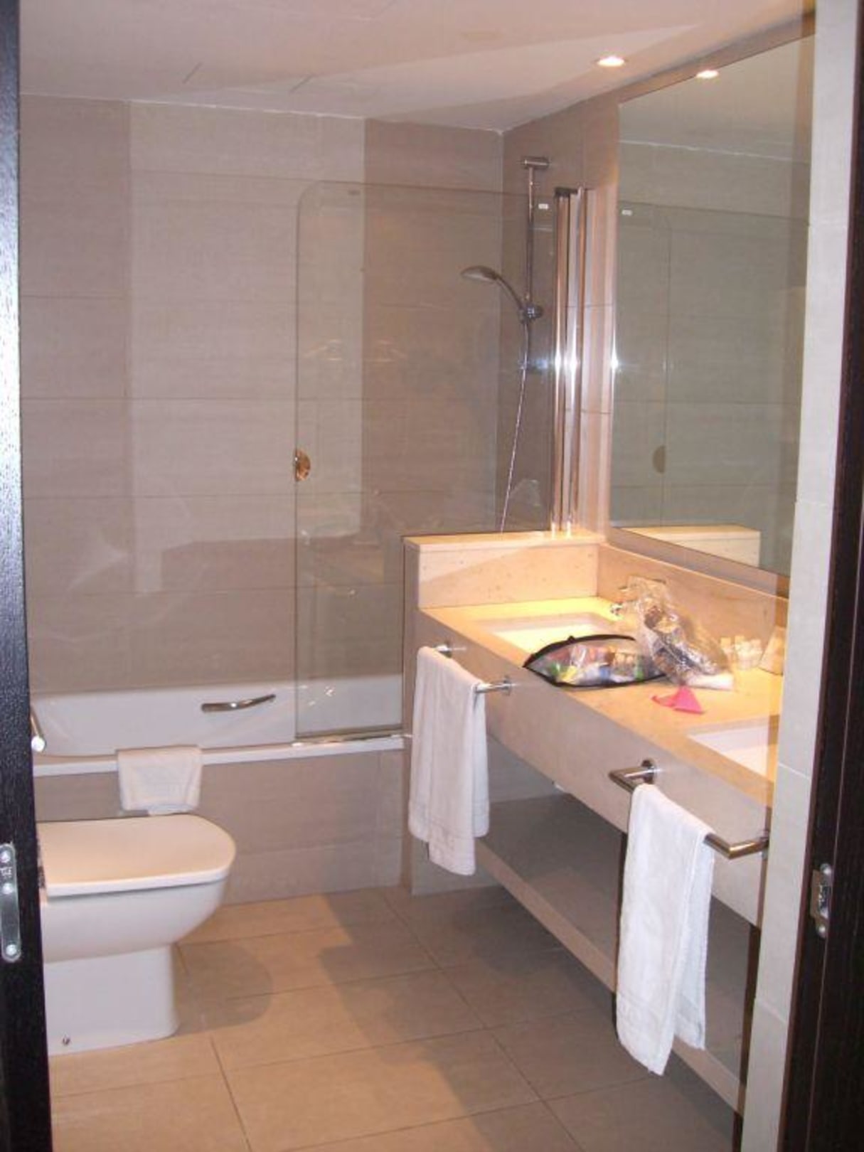 Sauberes modernes Bad mit Doppelbecken beim 3-Bett-Zimmer.