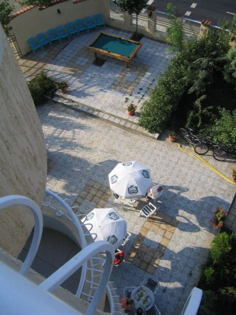 Hotel Consul mit Terrasse zum Frühstücken und Billardtisch im Hintergrund