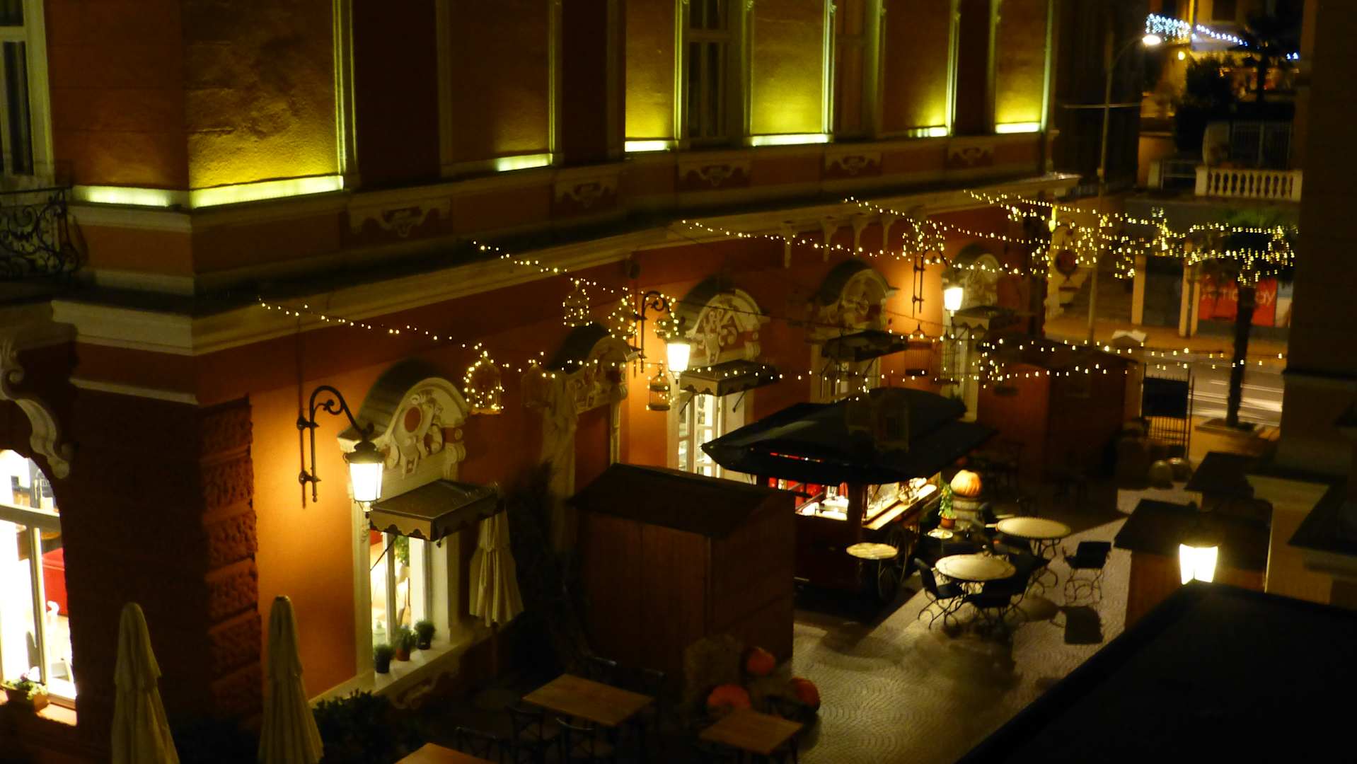 Ausblick von unserem Balkon in den Innenhof bei Nacht.
