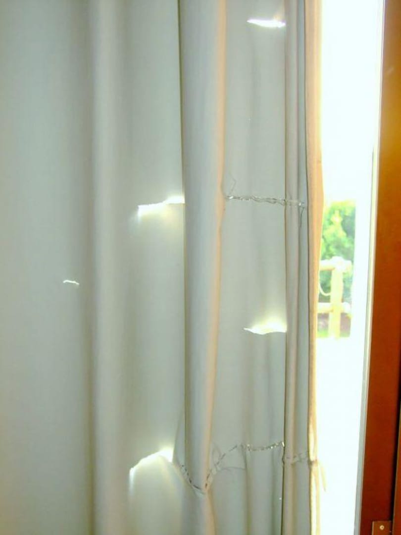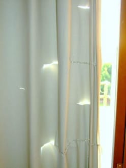 Gerissen - genähtdie Vorhänge sind auch schon ganz schön spröde durch die Sonne geworden, schützen aber noch vor allzu großer Wärme im Zimmer