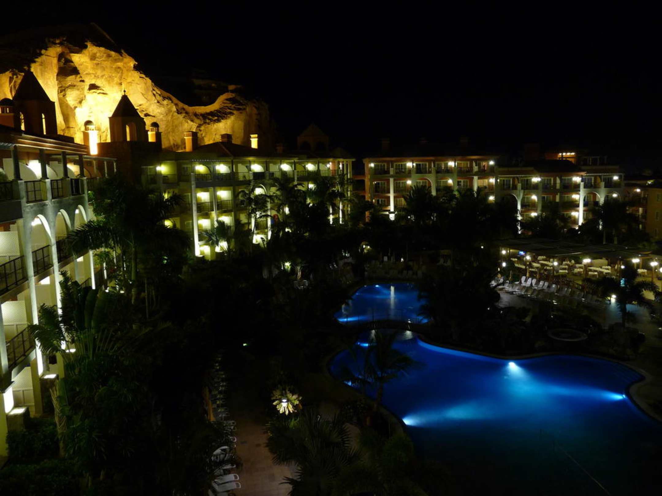 Die Anlage bei Nacht Auch bei Nacht sieht die Anlage sehr schön aus, besonders im Hintergrund der beleuchtete Felsen.
