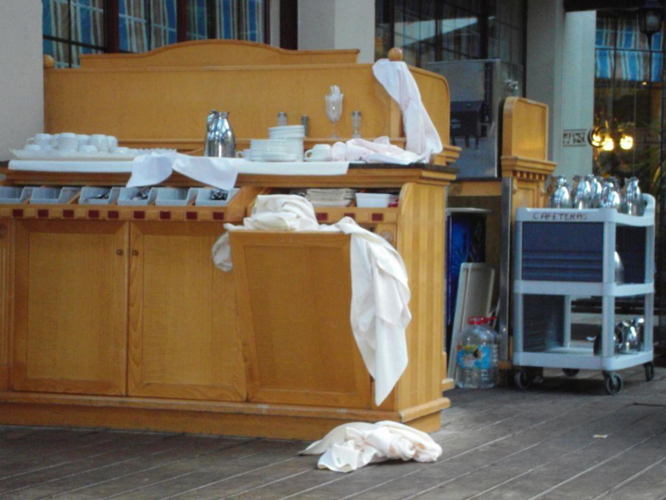 Ohne WorteCa. 15 Minuten mußten wir diesen Anblick beim Frühstück ertragen , bis sich endlich jemand erbarmte , dieses Chaos zu beseitigen .