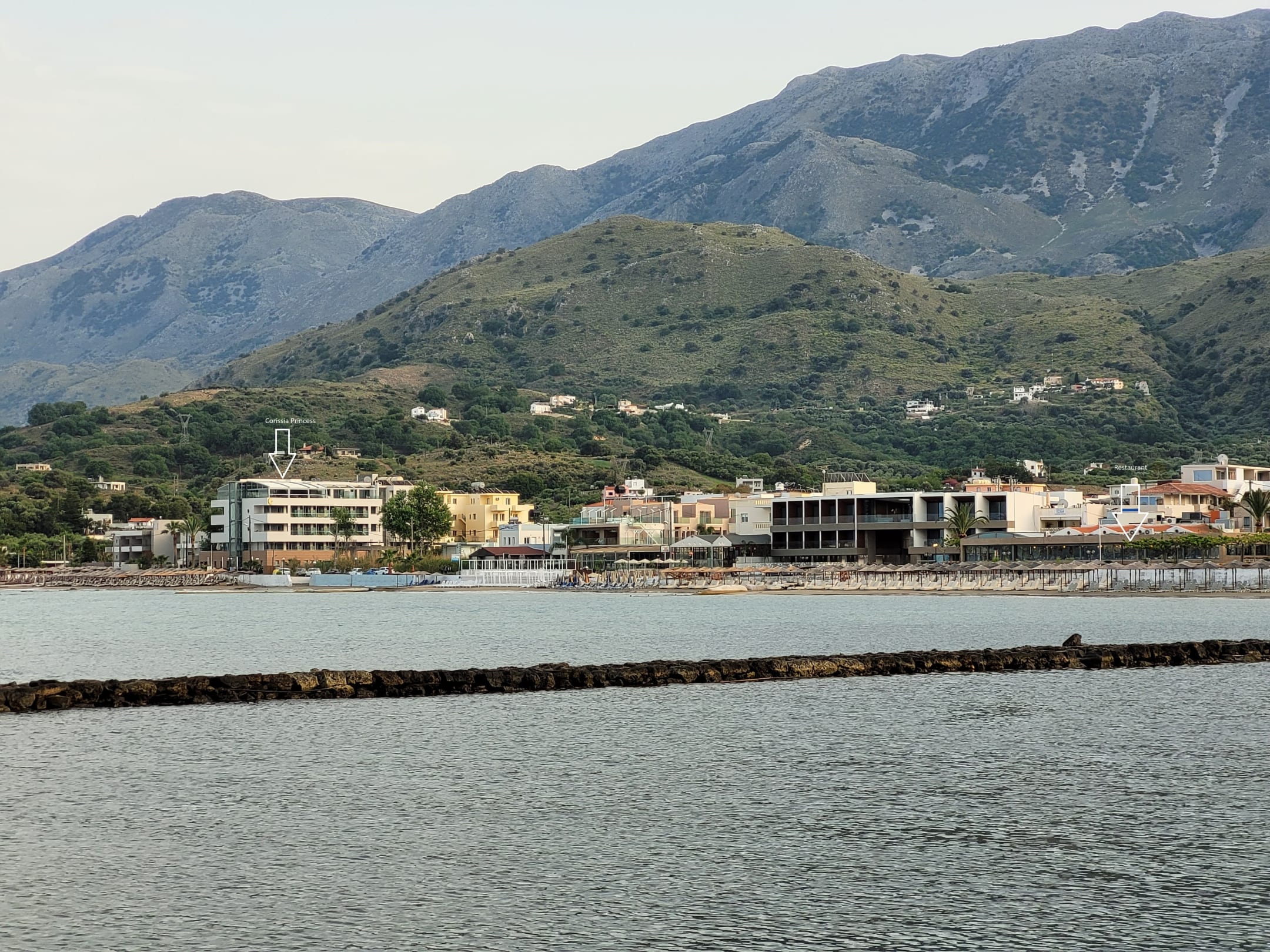 AußenansichtDer linke Pfeil zeigt das Hotel, der rechte Pfeil die Lage des Restaurants Corissia Park