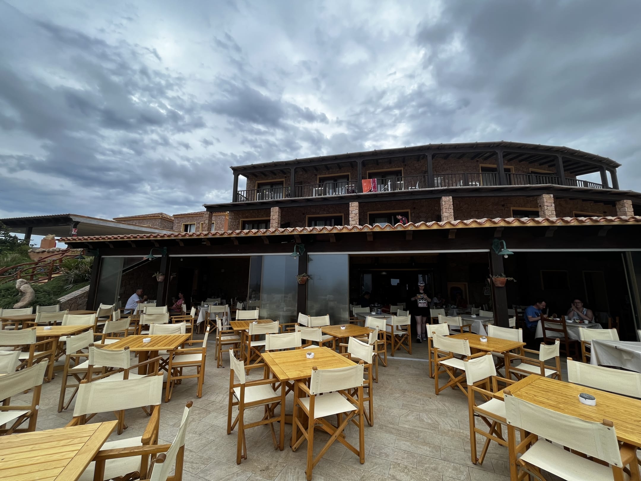 Ausblick auf das Restaurant und Hotel links