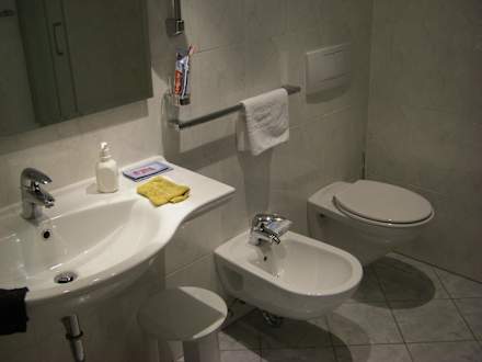 Bad und Fön, rechts Duschkabine