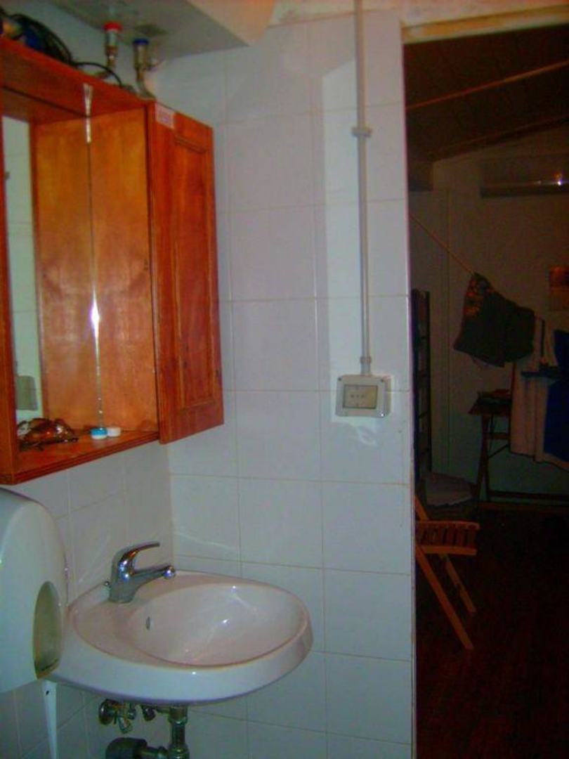 Waschbecken, Spiegel und schicker Holzschrank