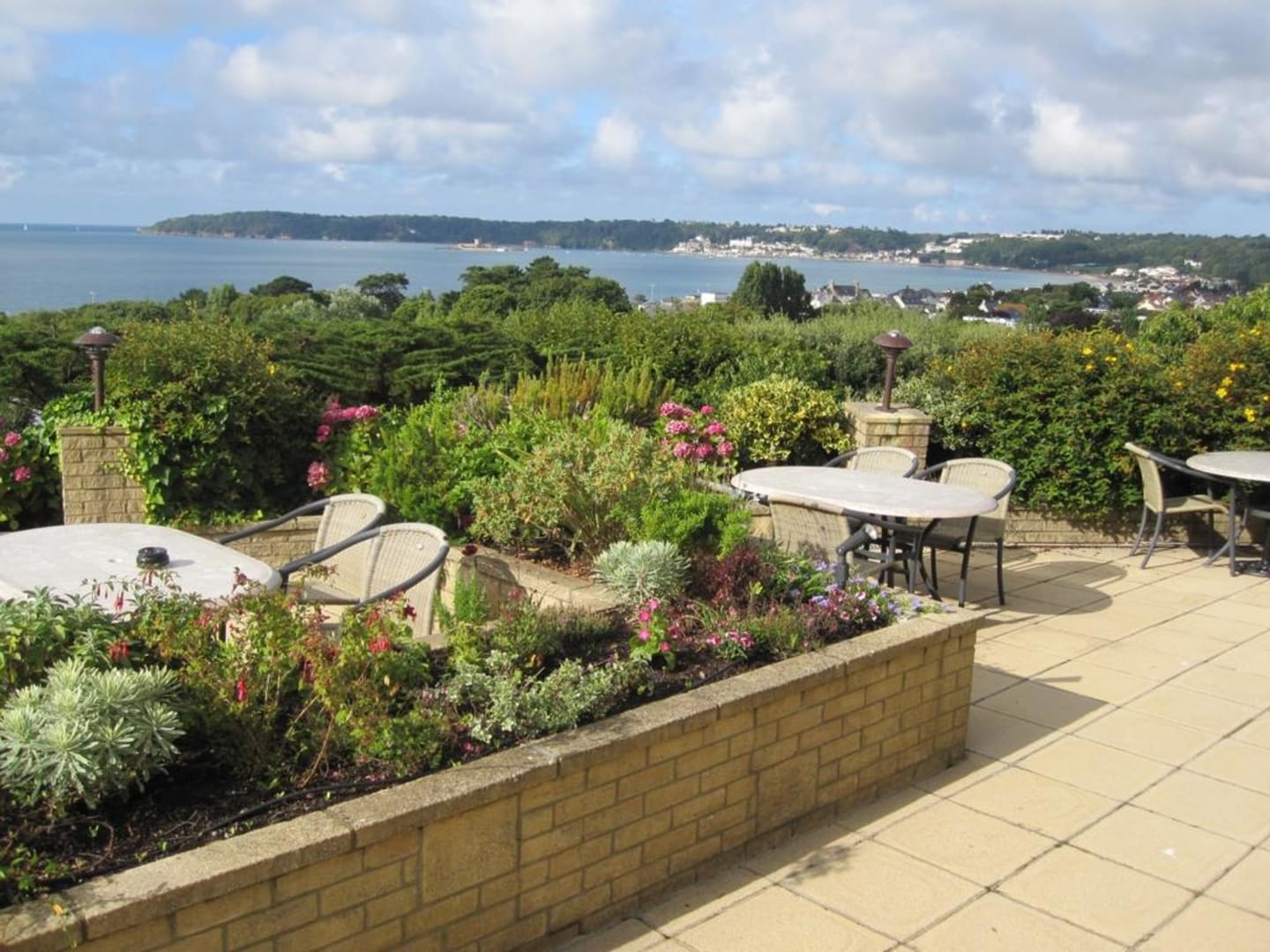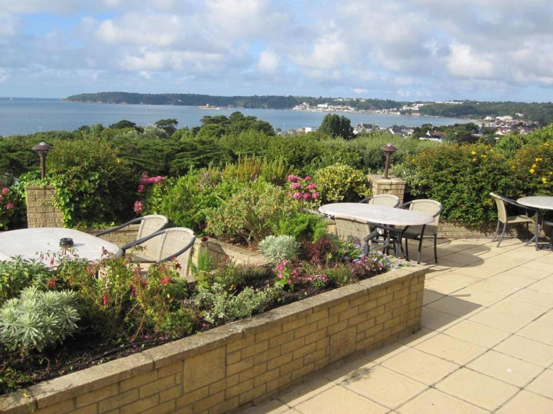 Von der Hotelbar (mit Wintergarten und schönen Korbmöbeln) kommt man direkt durch eine große Terassentür auf diese wunderbare Terasse Man genießt einen herrlichen Blick über die ganze Bucht von St.Aubins Bucht.