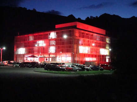 Beleuchtetes Hotel bei Nacht