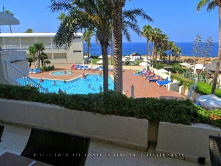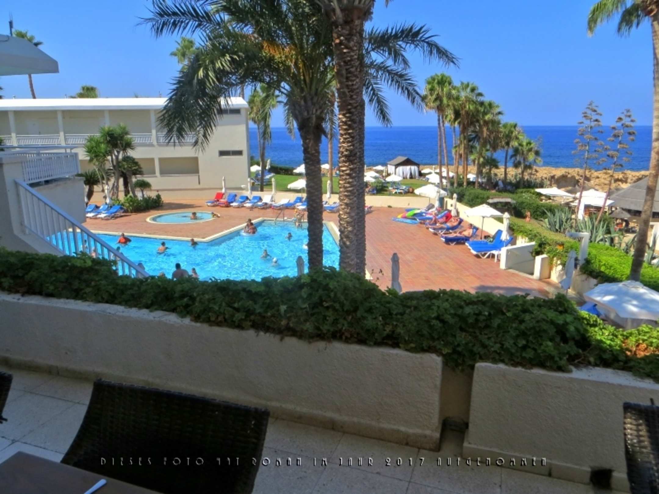 Blick von der Außenterrasse des Restaurants zum Pool und dem Badestrand am Meer.