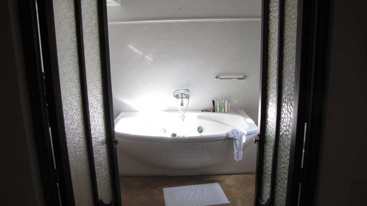 Blick vom Sofa in das Bad