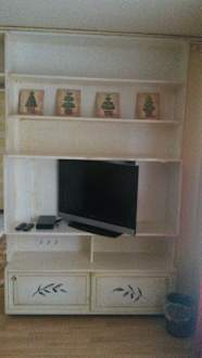 die Einbauwand/ Regal wurde an das Ambiente "etwas angepasst", aber die Scharnierlöcher um den TV herum nicht gut im Holz zugespachtelt. Sieht einfach billig aus.