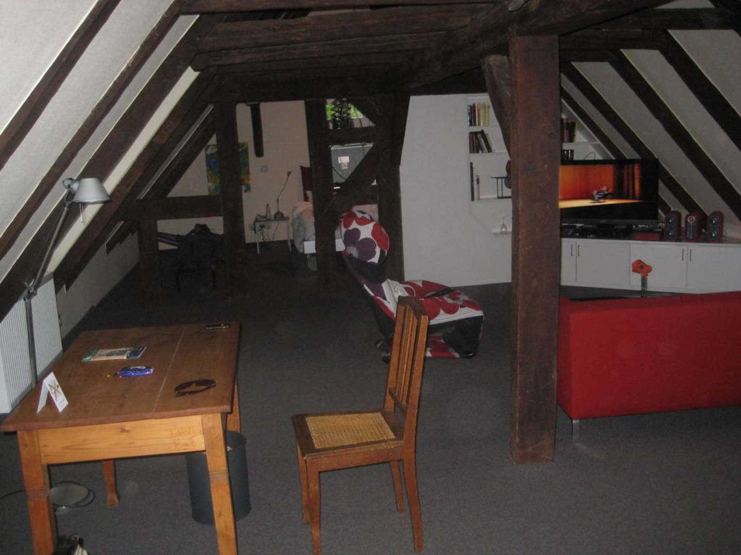 Penthaus - WohnzimmerBlick vom Badezimmer ins Wohnzimmer, rechts die Sitzecke mit TV, hinten der Durchgang zum Schlafzimmer (keine Tür)