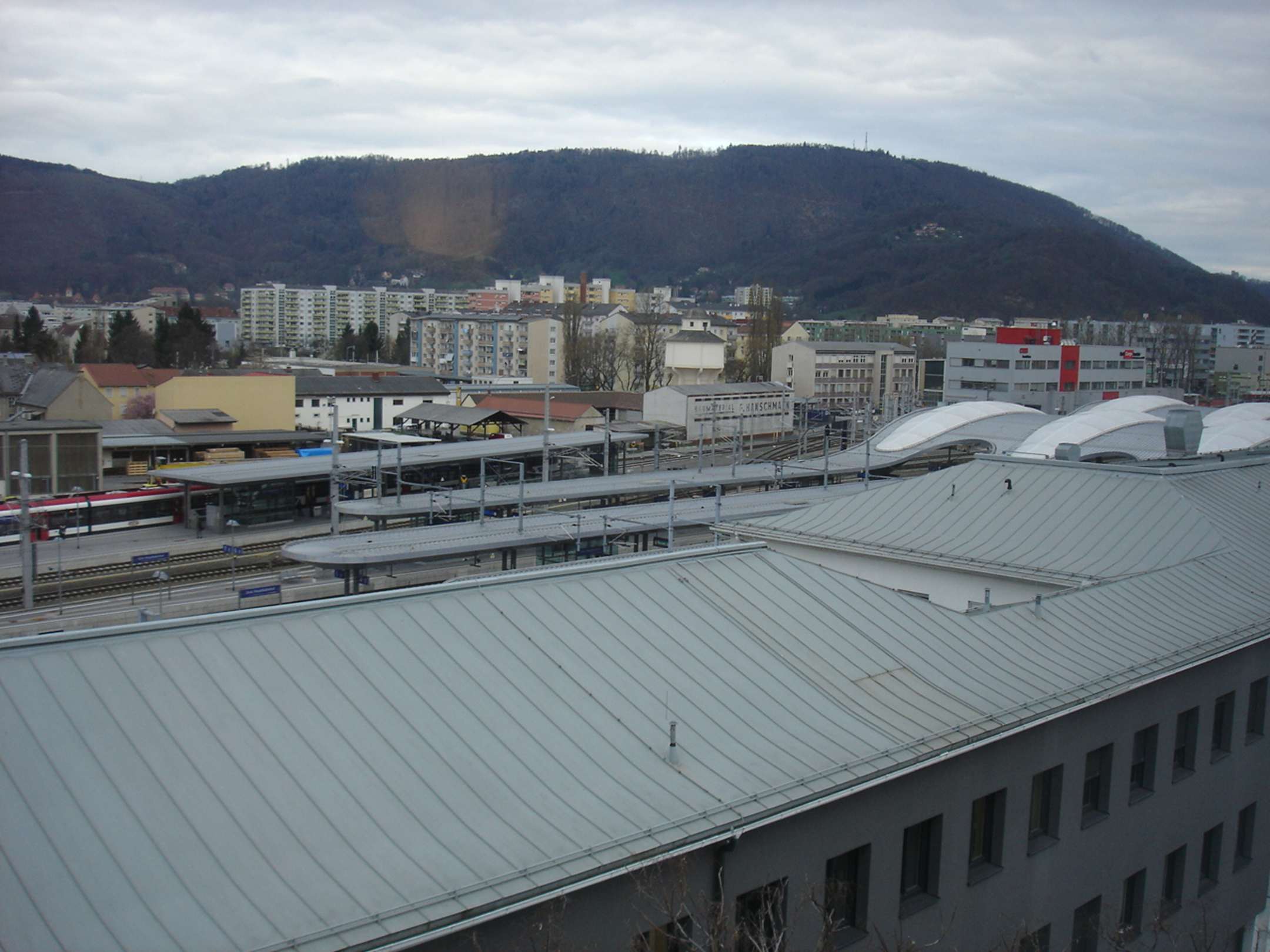 Blick vom Hotel über die Vororte von Graz, im Vordergrund der moderne Hauptbahnhof