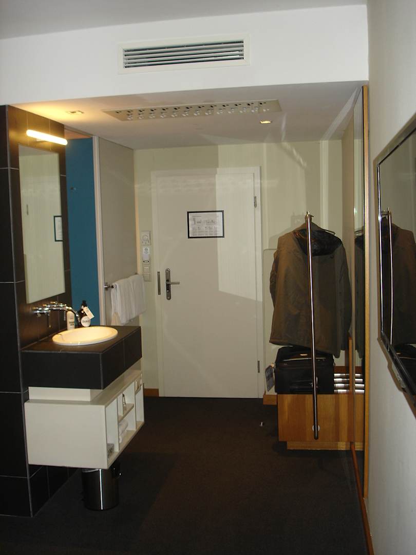 ZimmerMerwüdigerweise befindet sich das Waschbecken mitten im Zimmer auf dem Teppich (kein spezieller Bodenbelag im Bereich des Waschbeckens). Einen Kleiderschrank gibt es nicht im Zimmer, nur die im Hintergrund rechts sichtbare Konstruktion mit Bügeln.