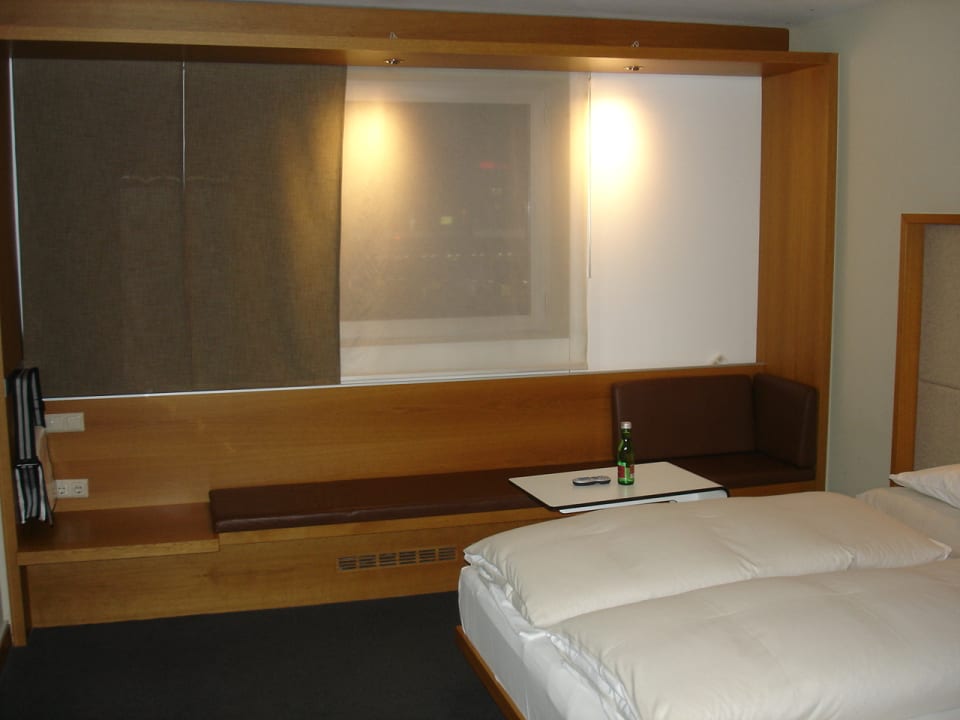 Fensterfront des Zimmers. Merkwürdigerweise gibt es keinen Stuhl sondern nur eine lange Sitzbank. Auch gibt es keinen Schreibtisch sondern nur ein kleines fahrbares Tischlein.