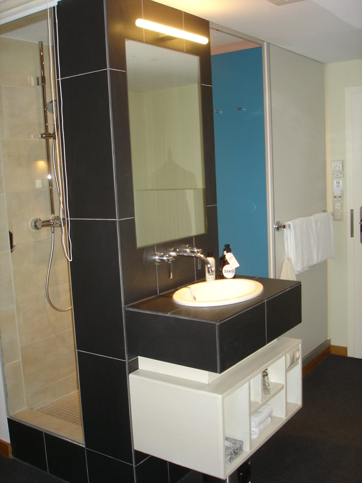 Waschbecken mitten im Zimmer. Dahinter die Dusche mit Fenster zum restlichen Zimmer hin.