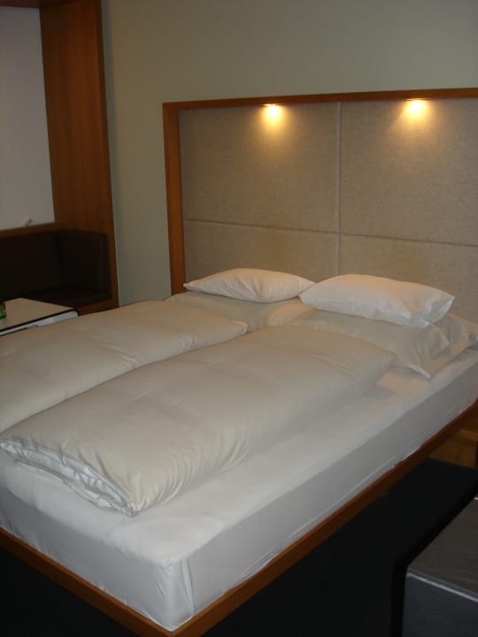 Bequemes Doppelbett (leider mit sehr kleinen und sehr niedrigen Nachttischen)