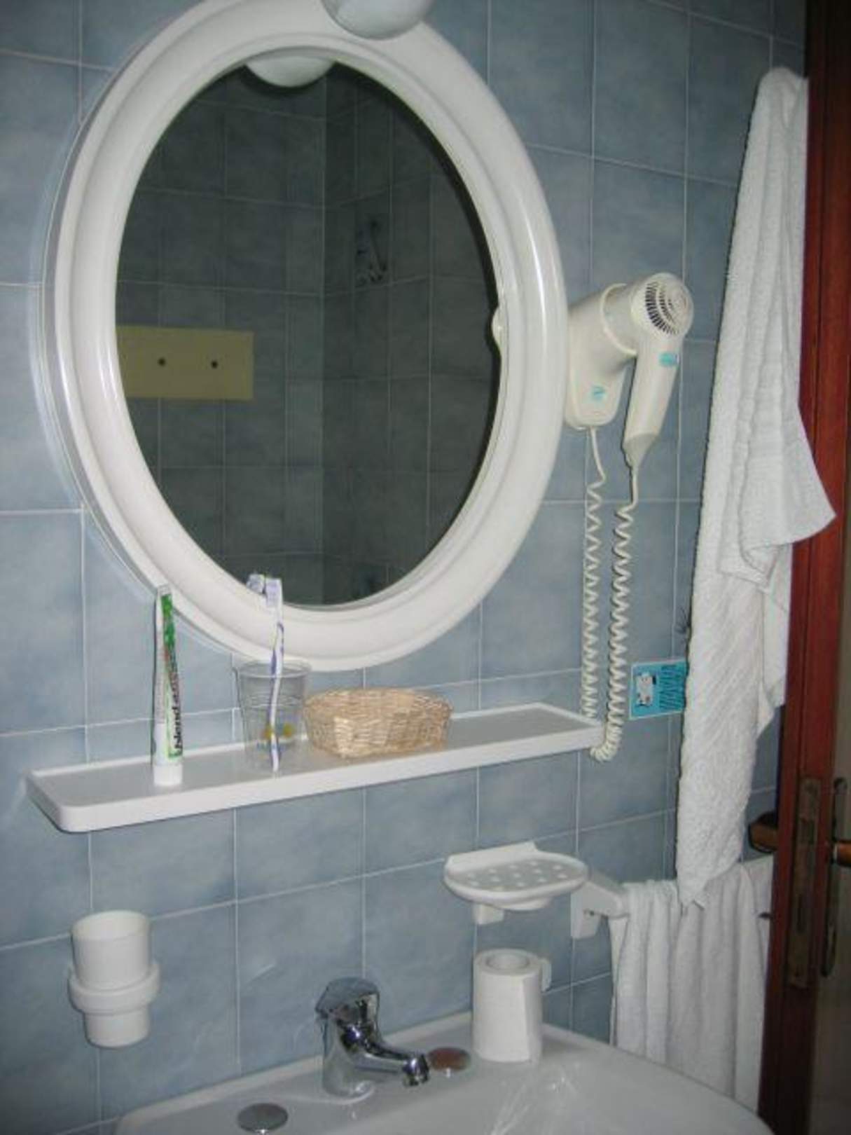 Waschbecken mit Spiegel und Fön. Bidet und Toilette waren auch im Badezimmer