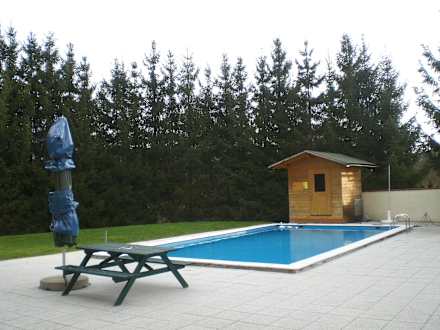 Blick in den Garten mit Pool und Liegewiese