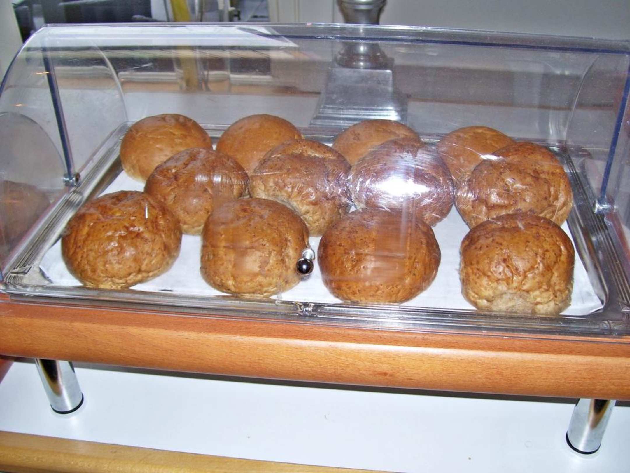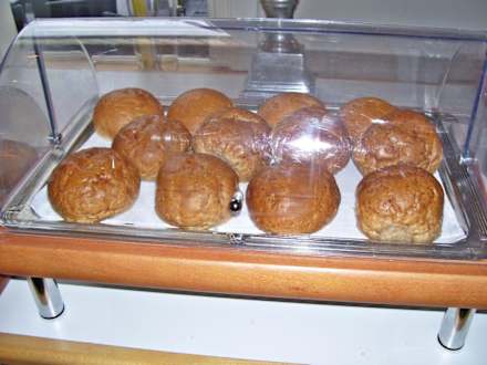 Aufgebackene schrumpflige Brötchen am Frühstücksbuffet